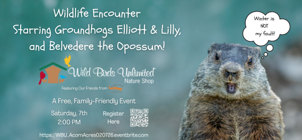 Join Wild Birds Unlimited and our special guests from Acorn Acres Wildlife Rehabilitation for a special family-friendly afternoon on Saturday, February 7th at 2:00 PM ET. We are thrilled to welcome Betsy Shank, CWR, the Founder and Executive Director of Acorn Acres, for an engaging presentation on wildlife conservation. The highlights of the event are undoubtedly our special guests: the Acorn Acres Ambassadors! Come meet Elliott the Groundhog, his adorable little sister Lilly, and Belvedere the Virginia Opossum. This event is free to the public and perfect for nature lovers of all ages who want to learn more about the incredible creatures that share our backyard.